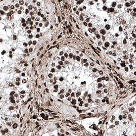 Bromodeoxyuridine/BrdU was detected in immersion fixed paraffin-embedded sections of human testis using Mouse Anti-Bromodeoxyuridine/BrdU Monoclonal Antibody (Catalog # MAB7225) at 1 µg/mL for 1 hour at room temperature followed by incubation with the Anti-Mouse IgG VisUCyte™ HRP Polymer Antibody (VC001). Before incubation with the primary antibody, tissue was subjected to heat-induced epitope retrieval using Antigen Retrieval Reagent-Basic (CTS013). Tissue was stained using DAB (brown) and counterstained with hematoxylin (blue). Specific staining was localized to cell nuclei. Staining was performed using our protocol for IHC Staining with VisUCyte HRP Polymer Detection Reagents.Applications for Bromodeoxyuridine/BrdU Antibody