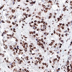 Bromodeoxyuridine/BrdU was detected in immersion fixed paraffin-embedded sections of human breast cancer tissue using Mouse Anti-Bromodeoxyuridine/BrdU Monoclonal Antibody (Catalog # MAB7225) at 1 µg/mL for 1 hour at room temperature followed by incubation with the Anti-Mouse IgG VisUCyte™ HRP Polymer Antibody (VC001). Before incubation with the primary antibody, tissue was subjected to heat-induced epitope retrieval using Antigen Retrieval Reagent-Basic (CTS013). Tissue was stained using DAB (brown) and counterstained with hematoxylin (blue). Specific staining was localized to cell nuclei. Staining was performed using our protocol for IHC Staining with VisUCyte HRP Polymer Detection Reagents.Bromodeoxyuridine/BrdU in Human Testis.