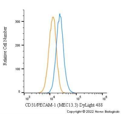 Flow Cytometry: CD31/PECAM-1 Antibody (MEC13.3) [DyLight 488] [NB600-1475G] - A surface stain was performed on MS1 cells with CD31/PECAM-1 [MEC13.3] Antibody NB600-1475G (blue) and a matched isotype control (orange). Cells were incubated in an antibody dilution of 5 ug/mL for 30 minutes at room temperature. Both antibodies were conjugated to DyLight 488.