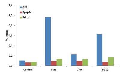 Chromatin Immunoprecipitation (ChIP): CRISPR-Cas9 Antibody Pack [NBP2-52986] - ChIP analysis of CRISPR-Cas9 antibody clones 7A9-3A3 and 6G12 on NIH3T3 cells which were stably expressing GFP-H2B, nuclease dead Cas9 (Flag tagged), and a GFP-targeting gRNA. The cells were fixed with formaldehyde, harvested and sonicated to get 200-500bp DNA fragments. 50ug chromatin was incubated over night at 4C with the indicated antibodies (200ul hybridoma supernatants of clones 7A9 and 6G12; 5ug Flag antibody) followed by incubation with protein G beads for 3h at 4C. After washing chromatin was eluted from the beads and crosslinking was reversed over night at 65C. After a proteinase K digestion step, DNA was separated using phenol/chloroform/isoamyl alcohol, precipitated with ethanol/sodium acetate and dissolved in water. For qPCR, primers either targeting the GFP gene or as negative control non-targeted regions (Ppap2c +7122 and Prkcd +24069 from transcription start) were used.