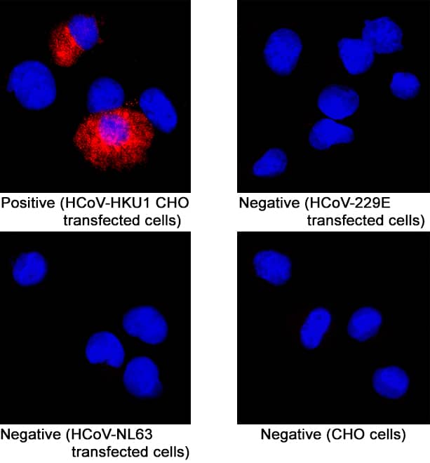 Spike RBD was detected in immersion fixed CHO Chinese hamster ovary cell line transfected with HCoV-HKU1 (positive staining), HCoV-229E transfected (negative staining), HCoV-NL63 transfected cell (negative staining), and CHO Chinese hamster ovary cell line (non-transfected, negative staining) using Mouse Anti-HCoV-HKU1 Spike RBD Monoclonal Antibody (Catalog # MAB10936) at 8 µg/mL for 3 hours at room temperature. Cells were stained using the NorthernLights™ 557-conjugated Anti-Mouse IgG Secondary Antibody (red; NL007) and counterstained with DAPI (blue). Specific staining was localized to cell cytoplasm. Staining was performed using our protocol for Fluorescent ICC Staining of Non-adherent Cells.