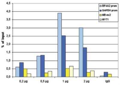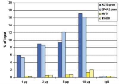 Chromatin Immunoprecipitation: Histone H3 [ac Lys27] Antibody [NBP2-54615] - ChIP assays were performed using human K562 cells, the antibody against H3K27ac and optimized PCR primer pairs for qPCR. ChIP was performed using sheared chromatin from 100,000 cells. A titration consisting of 0.2, 0.5, 1 and 2 ug of antibody per ChIP experiment was analyzed. IgG (1 ug/IP) was used as a negative IP control. Quantitative PCR was performed with primers for the promoters of the active GAPDH and EIF4A2 genes, used as positive controls, and for the coding regions of the inactive MB and MYT1 genes, used as negative controls. Figure 1 shows the recovery, expressed as a % of input (the relative amount of immunoprecipitated DNA compared to input DNA after qPCR analysis)
