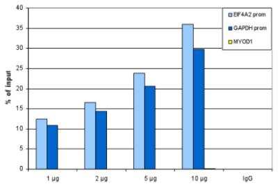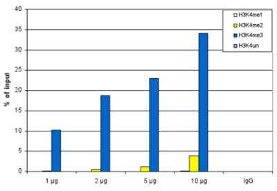 Chromatin Immunoprecipitation: Histone H3 [Trimethyl Lys4] Antibody [NBP2-59186] - Recovery of the nucleosomes carrying the H3K4me1, H3K4me2, H3K4me3 modifications and the unmodified H3K4 as determined by qPCR. The figure clearly shows the antibody is very specific in ChIP for the H3K4me3 modification. At higher concentrations some H3K4me2 is also precipitated.