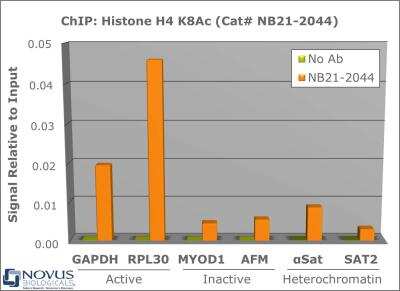 Chromatin Immunoprecipitation: Histone H4 [ac Lys8] Antibody [NB21-2044] - Chromatin from one million formaldehyde cross-linked HeLa cells was used with 2ug of NB21-2044 and 20ul of magnetic IgG beads per immunoprecipitation. A no antibody (No Ab) control was also used. Immunoprecipitated DNA was quantified using quantitative real-time PCR and SYBR green dye, then normalized to the non-precipitated input chromatin, which is equal to one.