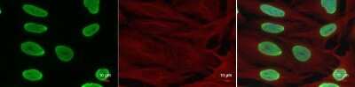 Immunocytochemistry/Immunofluorescence: Histone H4 [ac Lys8] Antibody [NBP2-42863] - Analysis of HeLa cells were fixed in 4% paraformaldehyde at RT for 15 min. Green: Histone H4 (acetyl Lys8) protein stained by Histone H4 (acetyl Lys8) antibody diluted at 1:500. Red: alpha Tubulin antibody [114], a cytoskeleton marker, stained by diluted at 1:500. Blue: Hoechst 33342 staining.