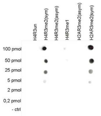 Dot Blot: Histone H4 [Dimethyl Arg3] Antibody [NBP2-59265] - To test the cross reactivity of the antibody against H4R3me2(sym), a Dot Blot analysis was performed with peptides containing other histone arginine methylations and the unmodified H4R3. One hundred to 0.2 pmol of the respective peptides were spotted on a membrane. The antibody was used at a dilution of 1:5,000. Figure shows the antibody is specific for the H4R3 symmetric dimethylation and also recognizes the H2AR3 symmetric dimethylation.