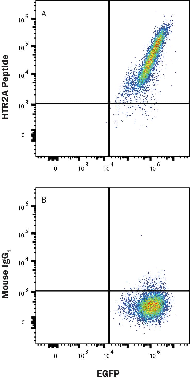 HEK293 human embryonic kidney cell line transfected with human 5-HT2A and eGFP was stained with (A) Mouse Anti-Human 5-HT2A Monoclonal Antibody (Catalog # MAB11250) or (B) Mouse IgG1 control antibody staining (MAB002) followed by Allophycocyanin-conjugated Anti-Mouse IgG Secondary Antibody (F0101B). View our protocol for Staining Membrane-associated Proteins.