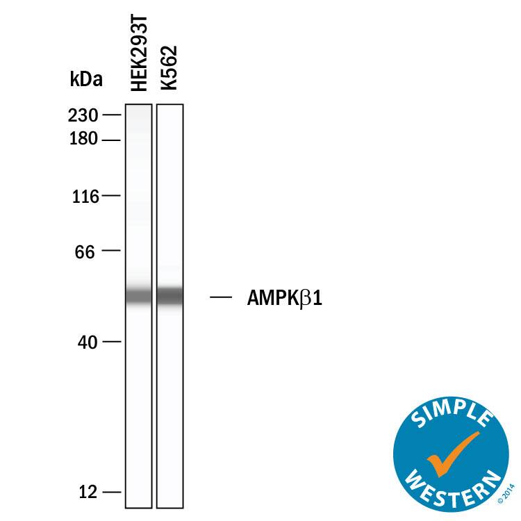 Simple Western shows lysates of HEK293T human embryonic kidney cell line and K562 human chronic myelogenous leukemia cell line, loaded at 0.5 mg/ml. A specific band was detected for AMPK beta1 at approximately 52 kDa (as indicated) using 10 µg/mL of Mouse Anti-Human AMPK beta1 Monoclonal Antibody (Catalog # MAB11642). This experiment was conducted under reducing conditions and using the 12-230 kDa separation system.