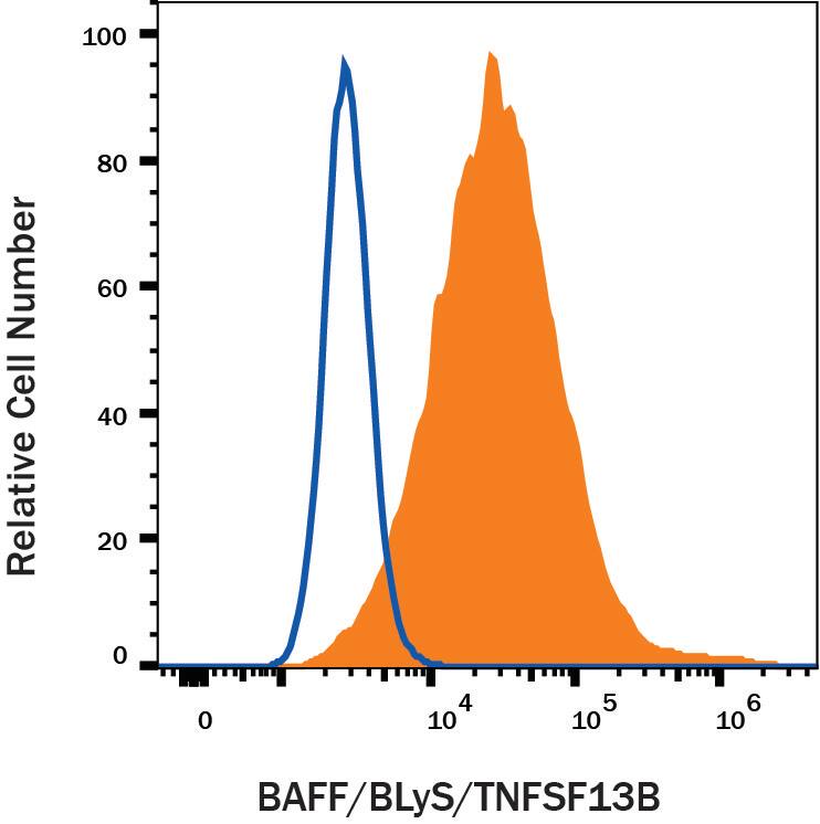 THP-1 cells were stained with Mouse Anti-Human BAFF/BLyS/TNFSF13B PE-conjugated Monoclonal Antibody (Catalog # IC1241P, filled histogram) or isotype control antibody (Catalog # IC002P, open histogram). View our protocol for Staining Membrane-associated Proteins.Applications for Human BAFF/BLyS/TNFSF13B PE-conjugated Antibody