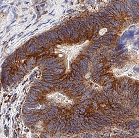 BAK was detected in immersion fixed paraffin-embedded sections of Human Colon using Rabbit Anti-Human BAK Antigen Affinity-purified Polyclonal Antibody (Catalog # AF816) at 5 µg/mL for 1 hour at room temperature followed by incubation with the Anti-Rabbit IgG VisUCyte™ HRP Polymer Antibody (Catalog # VC003). Before incubation with the primary antibody, tissue was subjected to heat-induced epitope retrieval using VisUCyte Antigen Retrieval Reagent-Basic (Catalog # VCTS021). Tissue was stained using DAB (brown) and counterstained with hematoxylin (blue). Specific staining was localized to cell membrane in epithelial cells in mucosal glands. View our protocol for IHC Staining with VisUCyte HRP Polymer Detection Reagents.