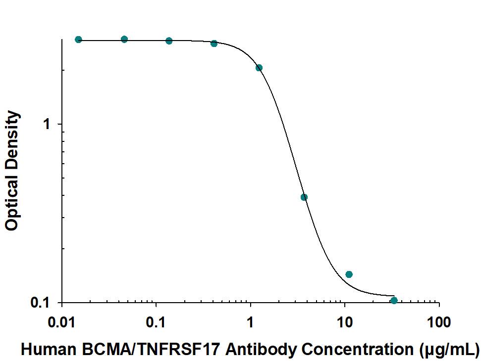 Human BCMA/TNFRSF17 Antibody (Catalog # MAB1933) blocks the binding of Recombinant Human BCMA/TNFRSF17 Fc Chimera (193-BC) to Recombinant Human APRIL/TNFSF13 (5860-AP) in a functional ELISA binding assay. The ND50 for this effect is 0.500-6.00 µg/mL.Applications for Human BCMA/TNFRSF17 Antibody
