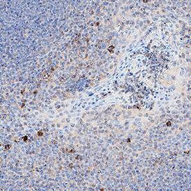 BCMA/TNFRSF17 was detected in immersion fixed paraffin-embedded sections of human tonsil using Mouse Anti-Human BCMA/TNFRSF17 Monoclonal Antibody (Catalog # MAB10762) at 5 µg/mL for 1 hour at room temperature followed by incubation with the Anti-Mouse IgG VisUCyte™ HRP Polymer Antibody (VC001). Before incubation with the primary antibody, tissue was subjected to heat-induced epitope retrieval using Antigen Retrieval Reagent-Basic (CTS013). Tissue was stained using DAB (brown) and counterstained with hematoxylin (blue). Specific staining was localized to lymphocytes. Staining was performed using our protocol for IHC Staining with VisUCyte HRP Polymer Detection Reagents.