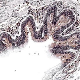 BPIFB1 was detected in immersion fixed paraffin-embedded sections of human lung cancer using Mouse Anti-Human BPIFB1 Monoclonal Antibody (Catalog # MAB101952) at 15 µg/mL for 1 hour at room temperature followed by incubation with the Anti-Mouse IgG VisUCyte™ HRP Polymer Antibody (VC001). Before incubation with the primary antibody, tissue was subjected to heat-induced epitope retrieval using Antigen Retrieval Reagent-Basic (CTS013). Tissue was stained using DAB (brown) and counterstained with hematoxylin (blue). Specific staining was localized to epithelial cells in bronchioles. Staining was performed using our protocol for IHC Staining with VisUCyte HRP Polymer Detection Reagents.