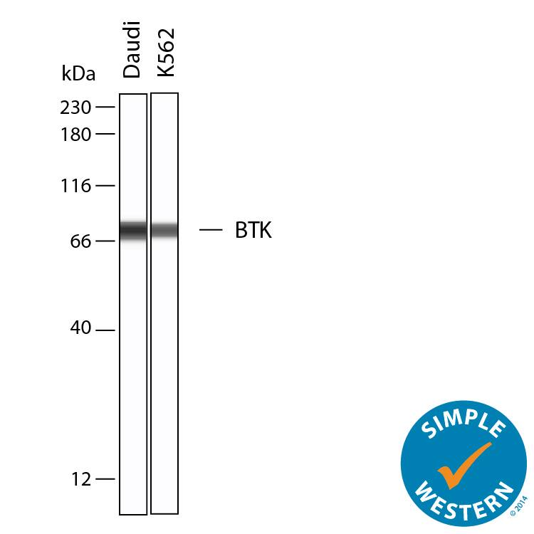 Simple Western shows lysates of Daudi human Burkitt's lymphoma cell line and K562 human chronic myelogenous leukemia cell line, loaded at 0.2 mg/ml. A specific band was detected for BTK at approximately 75 kDa (as indicated) using 10 µg/mL of Mouse Anti-Human BTK Monoclonal Antibody (Catalog # MAB5807). This experiment was conducted under reducing conditions and using the 12-230 kDa separation system.Applications for Human BTK Antibody