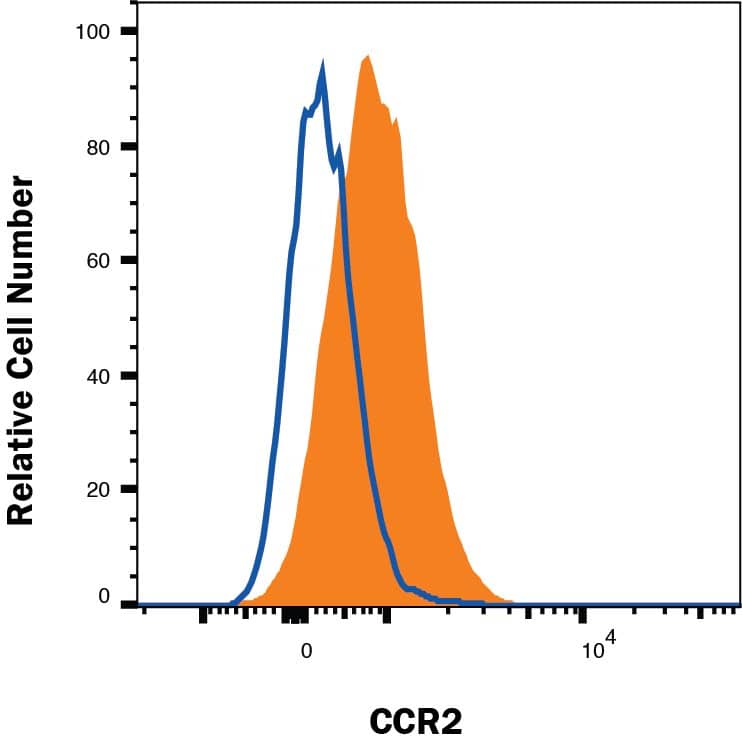 Human peripheral blood mononuclear cell (PBMC) monocytes were stained with Mouse Anti-Human CCR2 Alexa Fluor® 700-conjugated Monoclonal Antibody (Catalog # FAB151N, filled histogram) or Mouse IgG2BAlexa Fluor 700 Isotype Control (IC0041N, open histogram). Staining was performed using Staining Membrane-associated Proteins protocol.Applications for Human CCR2 Alexa Fluor® 700-conjugated Antibody