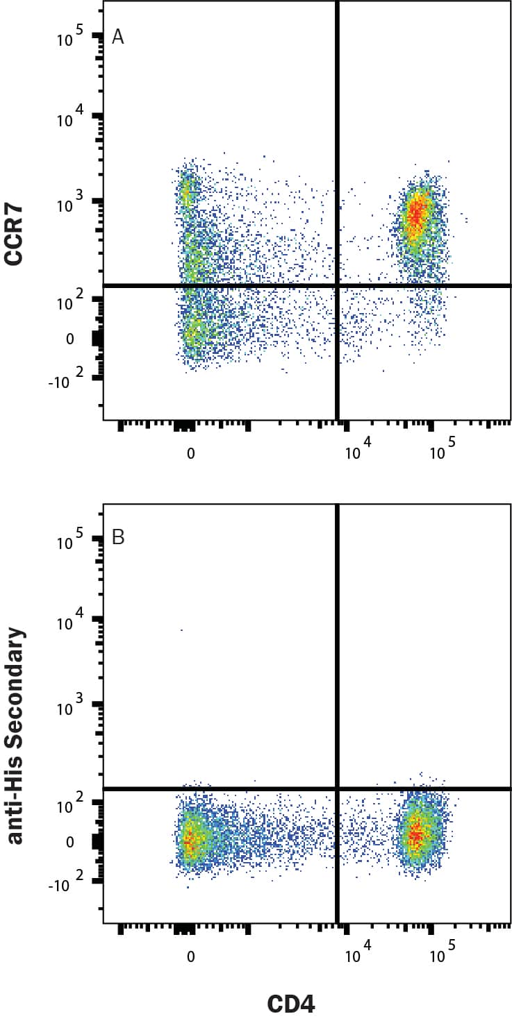 Human peripheral blood lymphocytes were stained with (A) Mouse Anti-Human CCR7 FAB2 Recombinant Monoclonal Antibody (Catalog # MAB197R-FAB2) or (B) Mouse IgG2A isotype control antibody (MAB003), followed by PE-conjugated Anti-His Antibody (IC050P) and Mouse anti-Human CD4 APC-conjugated Monoclonal Antibody (FAB3791A). Staining was performed using our Staining Membrane-Associated Proteins protocol.Applications for Human CCR7 Antibody