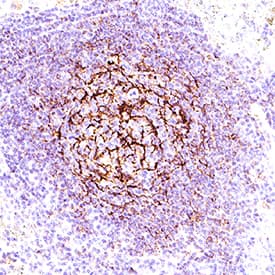 CD23/Fc epsilon RII was detected in immersion fixed paraffin-embedded sections of Human Lymph Nodes using Mouse Anti-Human CD23/Fc epsilon RII Monoclonal Antibody (Catalog # MAB123) at 5 µg/mL for 1 hour at room temperature followed by incubation with the Anti-Goat IgG VisUCyte™ HRP Polymer Antibody (Catalog # VC004). Before incubation with the primary antibody, tissue was subjected to heat-induced epitope retrieval using VisUCyte Antigen Retrieval Reagent-Basic (Catalog # VCTS021). Tissue was stained using DAB (brown) and counterstained with hematoxylin (blue). Specific staining was localized to cell membrane in lymphocytes. View our protocol for IHC Staining with VisUCyte HRP Polymer Detection Reagents.