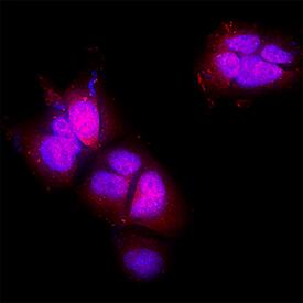 CFL1 was detected in immersion fixed MCF-7 human breast cancer cell line using Mouse Anti-Human CFL1 Monoclonal Antibody (Catalog # MAB11669) at 8 µg/ml for 3 hours at room temperature. Cells were stained using the NorthernLights™ 557-conjugated Anti-Mouse IgG Secondary Antibody (red; Catalog # NL007) and counterstained with DAPI (blue). Specific staining was localized to the nucleus and cytoplasm. View our protocol for Fluorescent ICC Staining of Cells on Coverslips.Applications for Human CFL1 Antibody