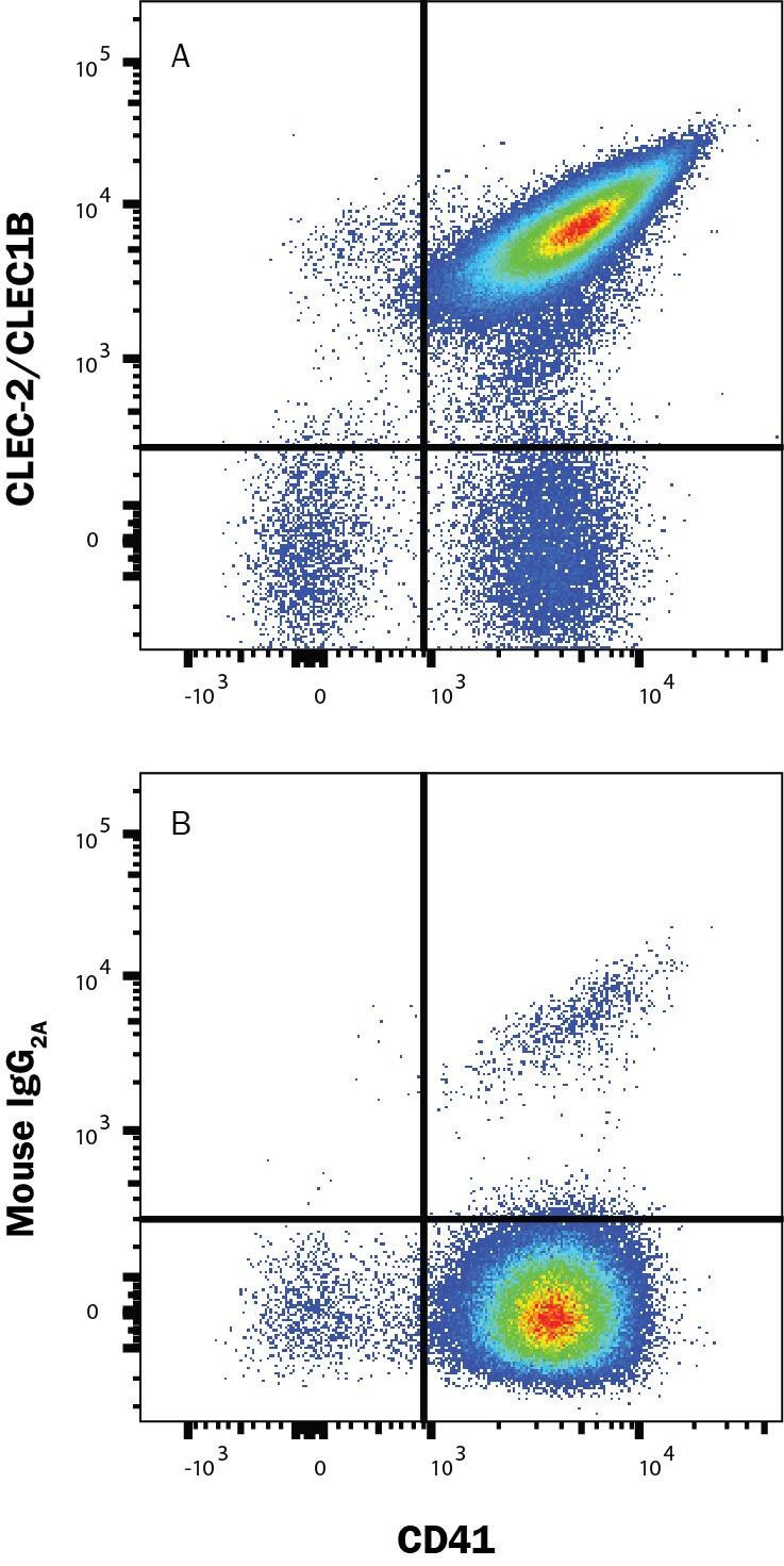 Platelets were stained with Mouse Anti-Human Integrin alpha2b/CD41 PE-conjugated Monoclonal Antibody (Catalog # FAB7616P) and either (A) Mouse Anti-Human CLEC-2/CLEC1B APC-conjugated Monoclonal Antibody (Catalog # FAB1718A) or (B) Mouse IgG2B Allophycocyanin Isotype Control (Catalog # IC0041A). View our protocol for Staining Membrane-associated Proteins.Applications for Human CLEC-2/CLEC1B APC-conjugated Antibody