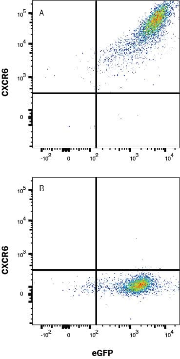 HEK293 cells transfected with Human CXCR6 and eGFP (A) vs irrelevant and eGFP (B) were stained with Mouse Anti-Human CXCR6 PE-conjugated Monoclonal Antibody (Catalog # FAB699P) at 37°C. View our protocol for Staining Membrane-associated Proteins.Detection of Human CXCR6 by Flow Cytometry