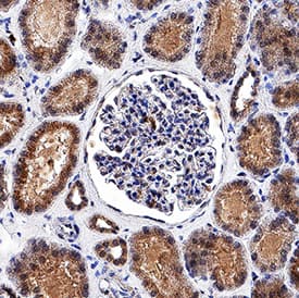 Cystatin C was detected in immersion fixed paraffin-embedded sections of Human Kidney using Mouse Anti-Human Cystatin C Monoclonal Antibody (Catalog # MAB11963) at 5 µg/mL for 1 hour at room temperature followed by incubation with the Anti-Mouse IgG VisUCyte™ HRP Polymer Antibody (Catalog # VC001). Before incubation with the primary antibody, tissue was subjected to heat-induced epitope retrieval using VisUCyte Antigen Retrieval Reagent-Basic (Catalog # VCTS021). Tissue was stained using DAB (brown) and counterstained with hematoxylin (blue). Specific staining was localized to convoluted tubules. View our protocol for IHC Staining with VisUCyte HRP Polymer Detection Reagents.Applications for Human Cystatin C Antibody