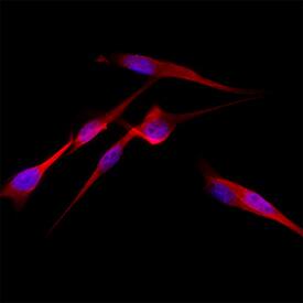 E6AP/UBE3A was detected in fixed A172 human glioblastoma cell line using Mouse Anti-Human E6AP/UBE3A Monoclonal Antibody (Catalog # MAB11546) at 8 µg/ml for 3 hours at room temperature. Cells were stained using the NorthernLights™ 557-conjugated Anti-Mouse IgG Secondary Antibody (red; Catalog # NL007) and counterstained with DAPI (blue). Specific staining was localized to the cytoplasm and nucleus. View our protocol for Fluorescent ICC Staining of Cells on Coverslips.Applications for Human E6AP/UBE3A Antibody