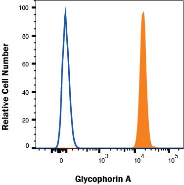 Human red blood cells were stained with Mouse Anti-Human Glycophorin A PE-conjugated Monoclonal Antibody (Catalog # FAB12281P, filled histogram) or isotype control antibody (Catalog # IC002P, open histogram). View our protocol for Staining Membrane-associated Proteins.Applications for Human Glycophorin A PE-conjugated Antibody