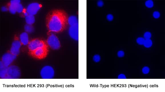 GPR88 was detected in immersion fixed HEK293 human cell line transfected with GPR88 (positive staining) and absent in HEK293 cell line (wild type, negative control) using Mouse Anti-Human GPR88 Monoclonal Antibody (Catalog # MAB108281) at 8 µg/mL for 3 hours at room temperature. Cells were stained using the NorthernLights™ 557-conjugated Anti-Mouse IgG Secondary Antibody (red; Catalog # NL007) and counterstained with DAPI (blue). Specific staining was localized to cytoplasm. View our protocol for Fluorescent ICC Staining of Non-adherent Cells.Applications for Human GPR88 Antibody