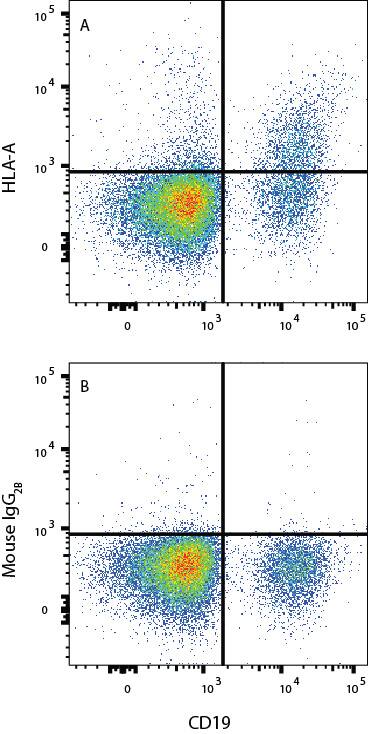 PBMC were stained with Mouse Anti-Human CD19 APC-conjugated Monoclonal Antibody (Catalog # FAB4867A) and either (A) Mouse Anti-Human HLA Class I Monoclonal Antibody (Catalog # MAB11502) or (B) isotype control antibody (Catalog # MAB004) followed by Phycoerythrin-conjugated Anti-Mouse IgG Secondary Antibody (Catalog # F0102B). View our protocol for Staining Membrane-associated Proteins.