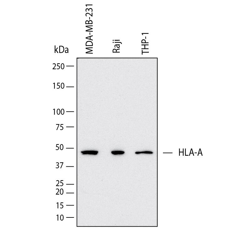 Western Blot shows lysates of MDA-MB-231 human breast cancer cell line, Raji human Burkitt's lymphoma cell line and THP-1 human acute monocytic leukemia cell line. PVDF membrane was probed with 2 µg/ml of Mouse Anti-Human HLA Class I Monoclonal Antibody (Catalog # MAB11502) followed by HRP-conjugated Anti-Mouse IgG Secondary Antibody (Catalog # HAF018). A specific band was detected for HLA Class I at approximately 48 kDa (as indicated). This experiment was conducted under reducing conditions and using Western Blot Buffer Group 1.
