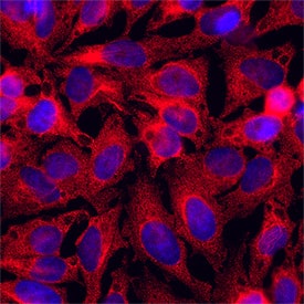 IL-15 was detected in immersion fixed using Mouse Anti-Human IL-15 Monoclonal Antibody (Catalog # MAB2472) at 8 µg/mL for 3 hours at room temperature. Cells were stained using the NorthernLights™ 557-conjugated Anti-Mouse IgG Secondary Antibody (red; Catalog # NL007) and counterstained with DAPI (blue). Specific staining was localized to cytoplasm. View our protocol for Fluorescent ICC Staining of Cells on Coverslips.Applications for Human IL-15 Antibody