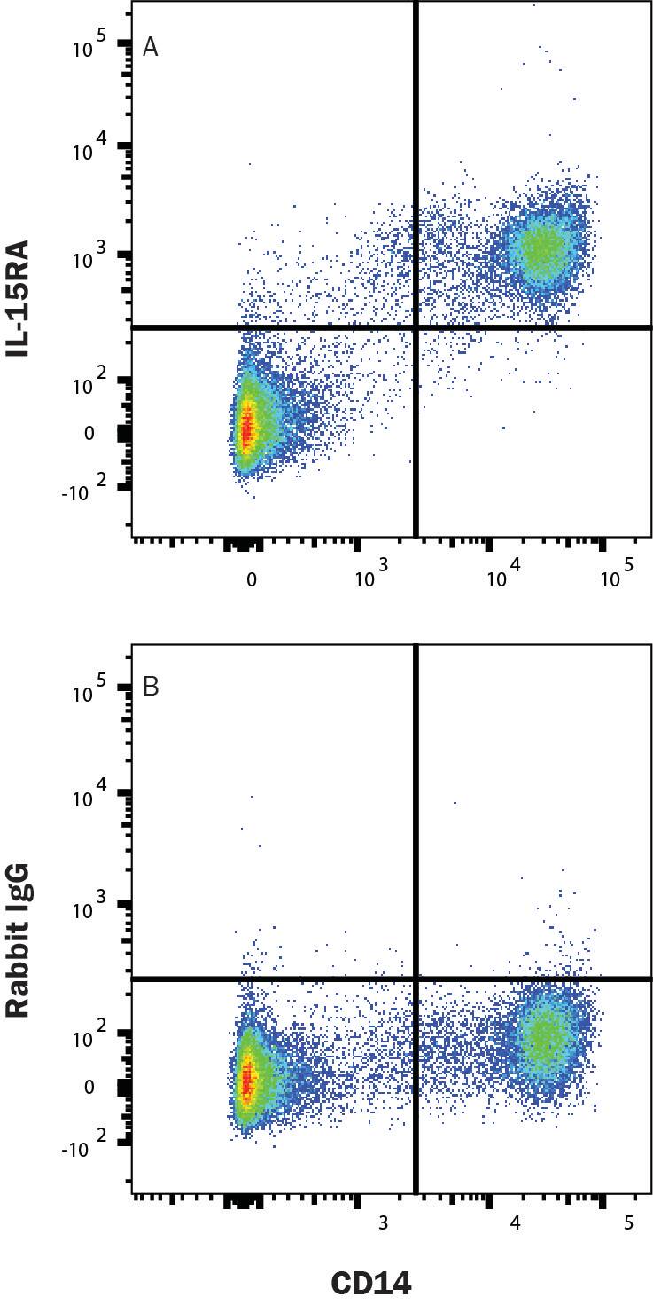 Human PBMC were treated with LPS (100 ng/ml) and recombinant human IFN gamma (285-IF; 25 ng/ml) for 24 hours, then stained with (A) Rabbit Anti-Human IL-15R alpha Monoclonal Antibody (Catalog # MAB10900) or (B) Rabbit IgG Control (MAB1050), followed by APC-conjugated anti-Rabbit IgG secondary antibody (F0111) and Mouse Anti-Human CD14 PE-conjugated Monoclonal Antibody (FAB3832P). Staining was performed using our Staining Membrane-associated Proteins protocol.