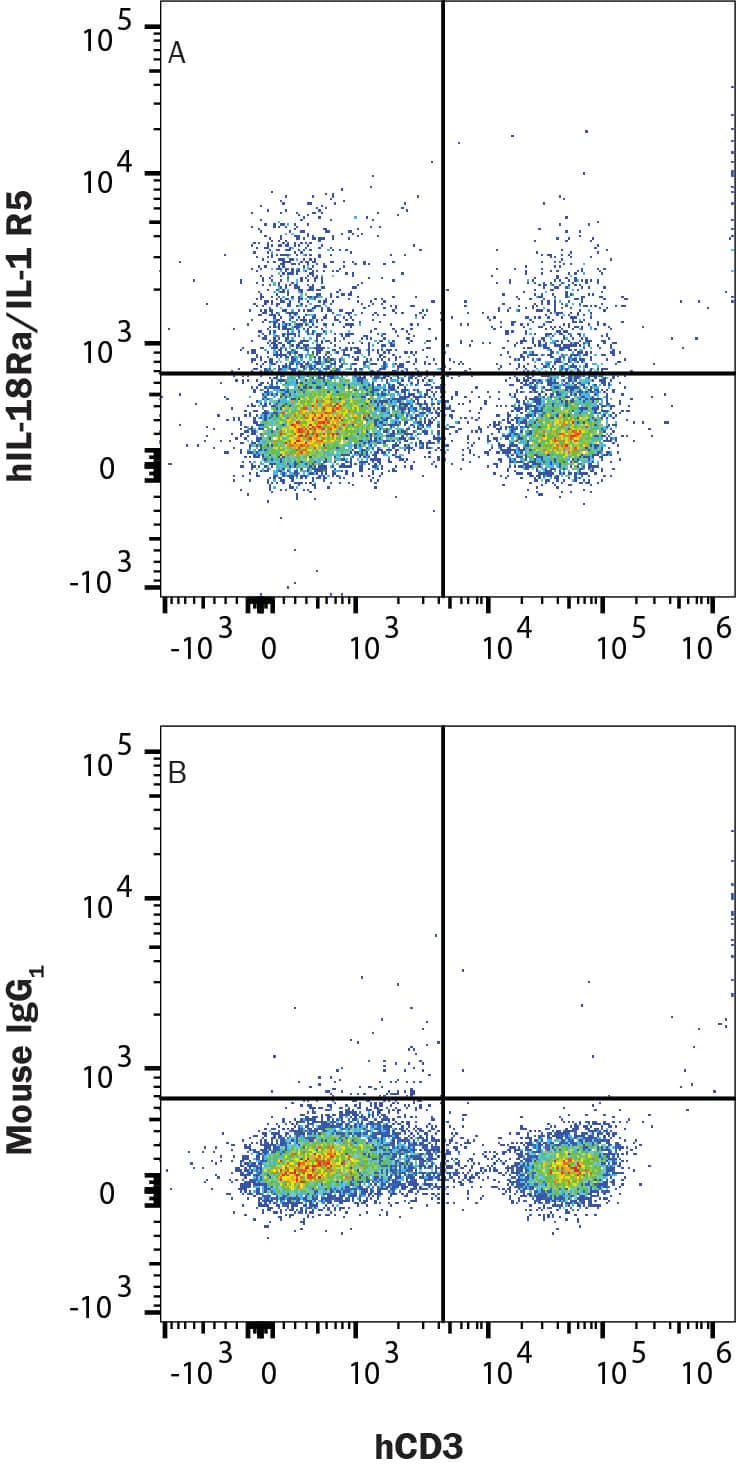 Human peripheral blood mononuclear cells (PBMCs) were stained with (A) Mouse Anti-Human IL-18 R alpha/IL-1 R5 Alexa Fluor® 647-conjugated Monoclonal Antibody (Catalog # FAB840R) or (B) Mouse IgG1 Alexa Fluor® 647-conjugated isotype control antibody (IC002R) followed by Mouse Anti-Human CD3 PE-conjugated Monoclonal Antibody (FAB100P). Staining was performed using our Staining Membrane-associated Proteins protocol.Applications