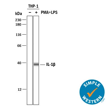 Detects human IL-1 beta/IL-1F2 in Western blots. Shows less than 5% cross-reactivity with recombinant mouse (rm) IL‑1 beta and rpIL‑1 beta and no cross-reactivity with rrIL‑1 beta, rmIL‑1 alpha, rhIL‑1ra, rmIL‑1ra, or rrIL‑1 alpha.