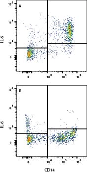 PBMC stimulated with 100 ng/ml of LPS and Brefeldin A for 24 hrs (A) or unstimulated (B) were stained with Mouse Anti-Human IL-6 Monoclonal Antibody (Catalog # MAB2061R) and Mouse Anti-Human CD14 PE-conjugated Monoclonal Antibody (Catalog # FAB3832P). To facilitate intracellular staining, cells were fixed with Flow Cytometry Fixation Buffer (1X) (FC004) and permeabilized with Saponin. View our protocol for Staining Intracellular Molecules.