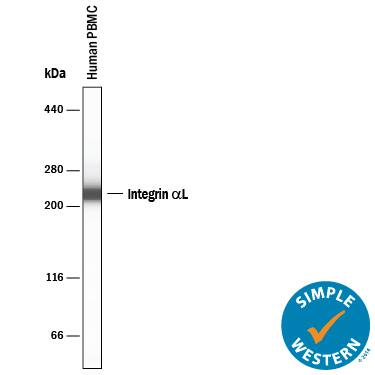 Simple Western lane view shows lysates of PBMC, Placenta, loaded at 0.2 mg/mL. A specific band was detected for Integrin alphaL/CD11a at approximately 220 kDa (as indicated) using 20 µg/mL of Mouse Anti-Human Integrin alphaL/CD11a Monoclonal Antibody (Catalog # MAB3595). This experiment was conducted under reducing conditions and using the 12-230 kDa separation system.Applications for Human Integrin alphaL/CD11a Antibody