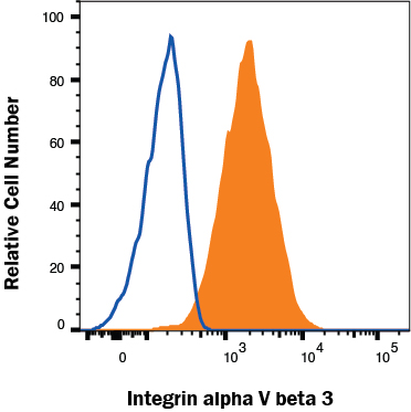 HUVEC human umbilical vein endothelial cells were stained with Mouse Anti-Human Integrin aV beta3 APC-conjugated Monoclonal Antibody (Catalog # FAB3050A, filled histogram) or isotype control antibody (Catalog # IC002A, open histogram). View our protocol for Staining Membrane-associated Proteins.Applications for Human Integrin alphaV beta3 APC-conjugated Antibody