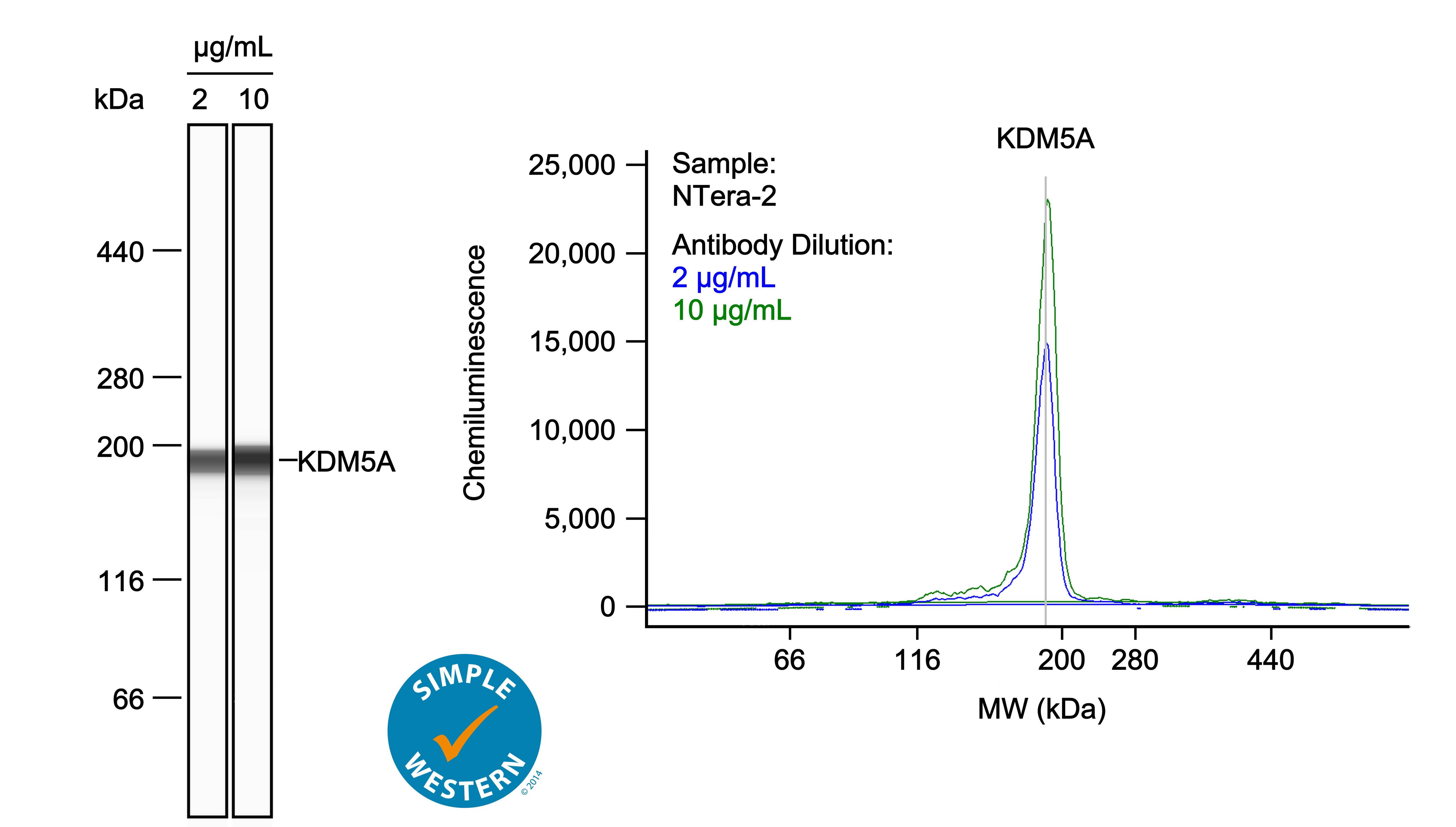Left: Simple Western lane view shows lysates of NTera-2 human testicular embryonic carcinoma cell line, loaded at 0.75 mg/ml. A specific band was detected for Jarid1A at approximately 191 kDa (as indicated) using both 2 µg/ml and 10 µg/ml of Mouse Anti-Human Jarid1A Monoclonal Antibody (Catalog # MAB11705) followed by HRP-conjugated Goat Anti-Mouse Secondary Antibody (Catalog # 042-205). This experiment was conducted under reducing conditions and using the 66-440kDa separation system. Right: Simple Western electropherogram showing the same Mouse Anti-Human Jarid1A Monoclonal Antibody (Catalog # MAB11705) tested at 2 µg/ml (blue line) and 10 µg/ml (green line) in the NTera-2 human testicular embryonic carcinoma cell line.