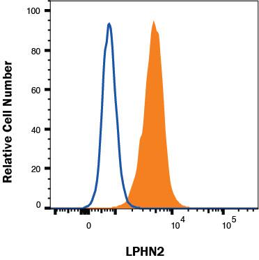 HEK293 Human Cell Line transfected with Human LPHN2 was stained with Mouse Anti-Human LPHN2 Monoclonal Antibody (Catalog # MAB105881, filled histogram) or isotype control antibody (MAB10041, open histogram), followed by Allophycocyanin-conjugated Anti-Mouse IgG Secondary Antibody (F0101B). To facilitate intracellular staining, cells were fixed with Flow Cytometry Fixation Buffer (FC004) and permeabilized with Flow Cytometry Permeabilization/Wash Buffer I (FC005). Staining was performed using our Staining Intracellular Molecules protocol.Applications for Human Latrophilin 2/LPHN2 Antibody