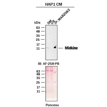 Immunoprecipitation was performed on concentrated culture media from HAP1 human near-haploid cell using 2.0 μg of Mouse Anti-Human Midkine Monoclonal Antibody (Catalog # MAB25823) pre-coupled to protein G or protein A beads. Immunoprecipitated Midkine was detected with Goat Anti-Human Midkine Polyclonal Antibody (AF-258-PB) at 1.0 μg/ml. The Ponceau stained transfers of each blot are shown. SM=10% starting material; UB=10% unbound fraction; IP=immunoprecipitated. Image, protocol, and testing courtesy of YCharOS Inc. (ycharos.com).