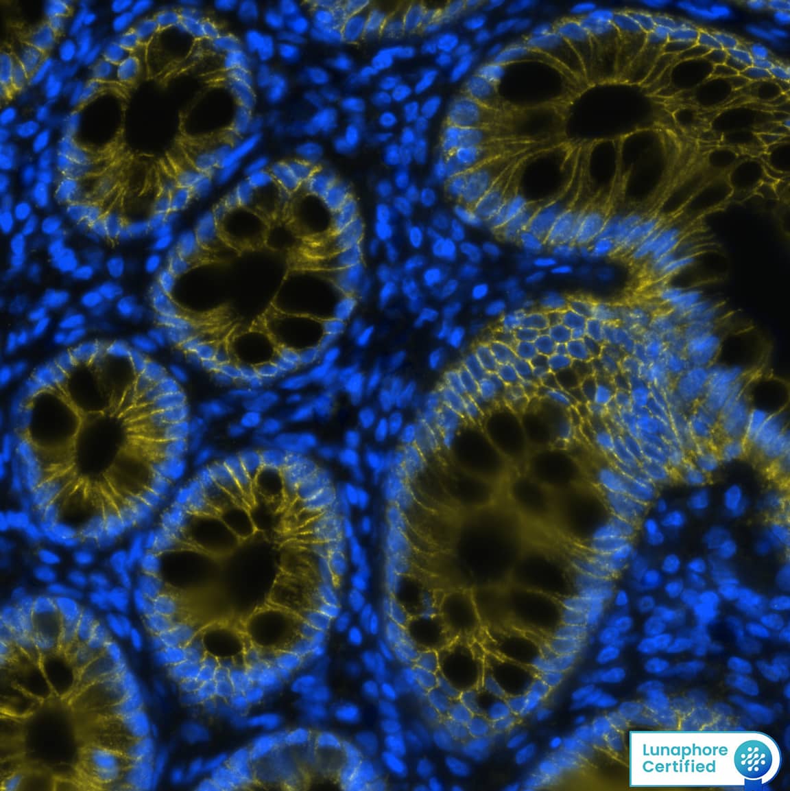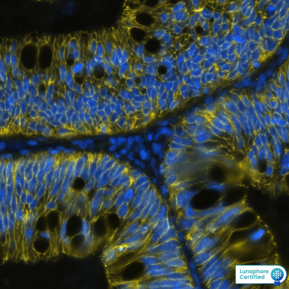 Cadherin was detected in immersion fixed paraffin-embedded sections of human colon using Mouse Anti-Human/Mouse Cadherin Pan Specific Monoclonal Antibody (MAB18385) at 15 μg/mL at 37° Celsius for 8 minutes. Before incubation with the primary antibody, tissue underwent an all-in-one dewaxing and antigen retrieval preprocessing using PreTreatment Module (PT Module) and Dewax and HIER Buffer H (pH 9). Tissue was stained using the Alexa Fluor™ 647 Goat anti-Mouse IgG Secondary Antibody at 1:200 at 37° Celsius for 8 minutes. (Yellow; Lunaphore Catalog # DR647MS) and counterstained with DAPI (blue; Lunaphore Catalog # DR100). Specific staining was localized to the membrane. Protocol available in COMET™ Panel Builder.Detection of Cadherin in Human Colon Cancer via Multiplex Immunofluorescence staining on COMET™