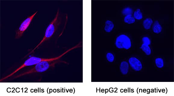 EphB2 was detected in immersion fixed C2C12 mouse myoblast cell line (positive staining) and HepG2 human hepatocellular carcinoma cell line using Rat Anti-Human/Mouse EphB2 Monoclonal Antibody (Catalog # MAB467) at 5 µg/mL for 3 hours at room temperature. Cells were stained using the NorthernLights™ 557-conjugated Anti-Rat IgG Secondary Antibody (red; NL013) and counterstained with DAPI (blue). Specific staining was localized to cytoplasm. Staining was performed using our protocol for Fluorescent ICC Staining of Non-adherent Cells.