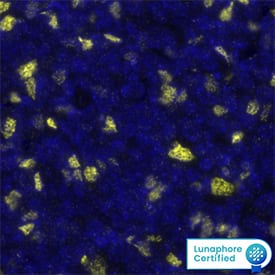 FOXP3 was detected in immersion fixed paraffin-embedded sections of Hodgkin's Lymphoma using Rabbit Anti-Human FOXP3 Monoclonal Antibody (Catalog # MAB8214) at 20 µg/mL at 37 ° Celsius for 4 minutes. Before incubation with the primary antibody, tissue underwent an all-in-one dewaxing and antigen retrieval preprocessing using PreTreatment Module (PT Module) and Dewax and HIER Buffer H (pH 9). Tissue was stained using the Alexa Fluor™ Plus 647 Goat anti-Rabbit IgG Secondary Antibody at 1:200 at 37 ° Celsius for 2 minutes. (Yellow; Lunaphore Catalog # DR647RB) and counterstained with DAPI (blue; Lunaphore Catalog # DR100). Specific staining was localized to the nucleus. Protocol available in COMET™ Panel Builder.Detection of FOXP3 in Mouse Thymus via seqIF™ staining on COMET™