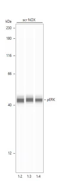 Western blot shows lysates of NIH-3T3 mouse embryonic fibroblast cell line untreated (-) or treated (+) with 10 ng/mL Recombinant Human PDGF-BB (Catalog # 220-BB) for 5 minutes. PVDF membrane was probed with 0.1 µg/mL of Rabbit Anti-Human/Mouse Phospho-ERK1 (T202/Y204)/ERK2 (T185/Y187) Monoclonal Antibody (Catalog # MAB18251) followed by HRP-conjugated Anti-Rabbit IgG Secondary Antibody (Catalog # HAF008). Specific bands were detected for Phospho-ERK1 (T202/Y204) at approximately 44 kDa and Phospho-ERK2 (T185/Y187) at approximately 42 (as indicated). This experiment was conducted under reducing conditions and using Immunoblot Buffer Group 1.Detection of Human Phospho-ERK1 (T202/Y204)/ERK2 (T185/Y187) by Simple WesternTM.