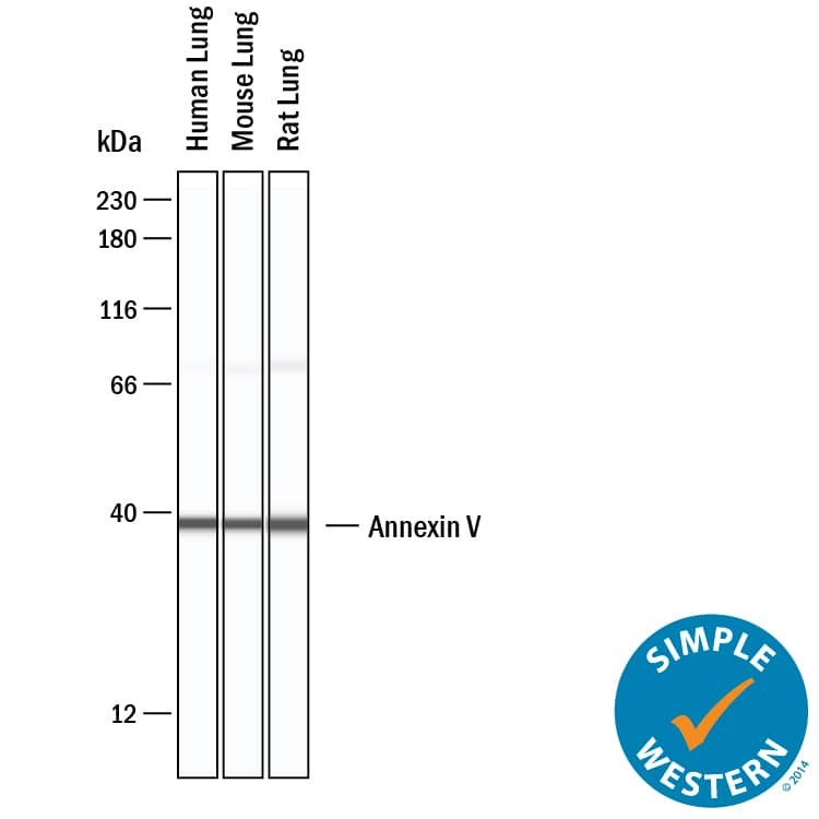 Simple Western lane view shows lysates of Human lung, mouse lung, rat lung, loaded at 0.2 mg/mL. A specific band was detected for Annexin V at approximately 38 kDa (as indicated) using 12.5 µg/mL of Goat Anti-Human/Mouse/Rat Annexin V Antigen Affinity-purified Polyclonal Antibody (Catalog # AF399) . This experiment was conducted under reducing conditions and using the 12-230 kDa separation system.