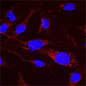 IMP Dehydrogenase 1/IMPDH1 was detected in immersion fixed C2C12 mouse myoblast cell line using Rabbit Anti-Human/Mouse/Rat IMP Dehydrogenase 1/IMPDH1 Antigen Affinity-purified Polyclonal Antibody (Catalog # AF8554) at 3 µg/mL for 3 hours at room temperature. Cells were stained using the NorthernLights™ 557-conjugated Anti-Rabbit IgG Secondary Antibody (red; NL004) and counterstained with DAPI (blue). Specific staining was localized to cytoplasm. Staining was performed using our protocol for Fluorescent ICC Staining of Non-adherent Cells.Applications for Human/Mouse/Rat IMP Dehydrogenase 1/IMPDH1 Antibody