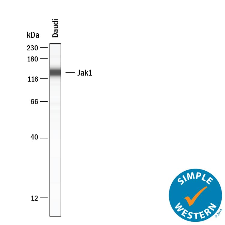 Simple Western lane view shows lysates of Daudi human Burkitt's lymphoma cell line, loaded at 0.2 mg/mL. A specific band was detected for Jak1 at approximately 136 kDa (as indicated) using 10 µg/mL of Rat Anti-Human/Mouse/Rat Jak1 Monoclonal Antibody (Catalog # MAB4260) . This experiment was conducted under reducing conditions and using the 12-230 kDa separation system.Applications for Human/Mouse/Rat Jak1 Antibody