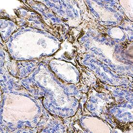 Nephronectin was detected in immersion fixed frozen sections of human thyroid using Mouse Anti-Human Nephronectin Monoclonal Antibody (Catalog # MAB8025) at 1.7 µg/mL for 1 hour at room temperature followed by incubation with the Anti-Mouse IgG VisUCyte™ HRP Polymer Antibody (VC001). Before incubation with the primary antibody, tissue was subjected to heat-induced epitope retrieval using Antigen Retrieval Reagent-Basic (CTS013). Tissue was stained using DAB (brown) and counterstained with hematoxylin (blue). Specific staining was localized to extracelluar connective tissue. Staining was performed using our protocol for IHC Staining with VisUCyte HRP Polymer Detection Reagents.