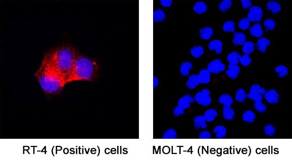 Osteoactivin/GPNMB was detected in fixed RT-4 human bladder carcinoma cell line and MOLT-4 human acute lymphoblastic leukemia cell line using Mouse Anti-Human Osteoactivin/GPNMB Monoclonal Antibody (Catalog # MAB11534) at 8 µg/ml for 3 hours at room temperature. Cells were stained using the NorthernLights™ 557-conjugated Anti-Mouse IgG Secondary Antibody (red; Catalog # NL007) and counterstained with DAPI (blue). Specific staining was localized to the cytoplasm and membrane. View our protocol for Fluorescent ICC Staining of Cells on Coverslips.Applications for Human Osteoactivin/GPNMB Antibody