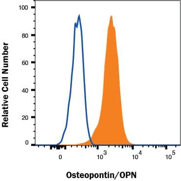 U937 cells were stained with Mouse Anti-Human Osteopontin/OPN Monoclonal Antibody (Catalog # mab14331, filled histogram) or isotype control antibody (Catalog # MAB003, open histogram) followed by Allophycocyanin-conjugated Anti-Mouse IgG Secondary Antibody (Catalog # F0101B). To facilitate intracellular staining, cells were fixed with Flow Cytometry Fixation Buffer (Catalog # FC004) and permeabilized with Flow Cytometry Permeabilization/Wash Buffer I (Catalog # FC005). View our protocol for Staining Intracellular Molecules.Applications for Human Osteopontin/OPN Antibody